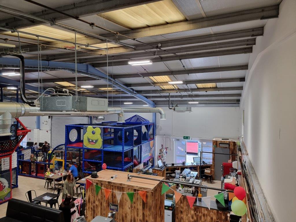 The café area in the soft play part of the building adjoins onto the nursery and is all on the ground floor. Our solution was to install a lightweight steel mezzanine floor over the café and seating area. This will maximize the height of the building and gain a whole new play room for the nursery.