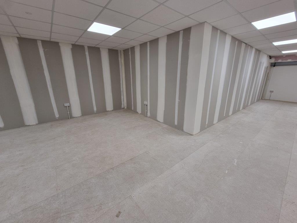 A 1-hour fire rated suspended ceiling was installed below the mezzanine floor with 1-hour fire rated column encasements fitted and a 1-hour fire rated bulkhead along the exposed front edge and stairwell.