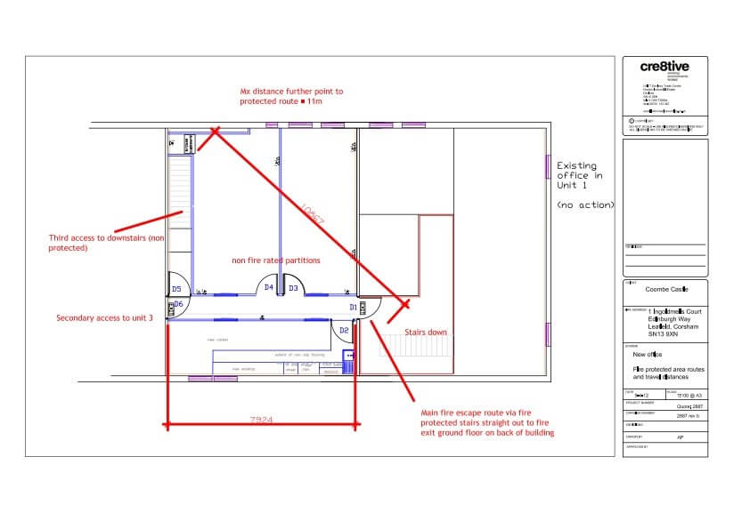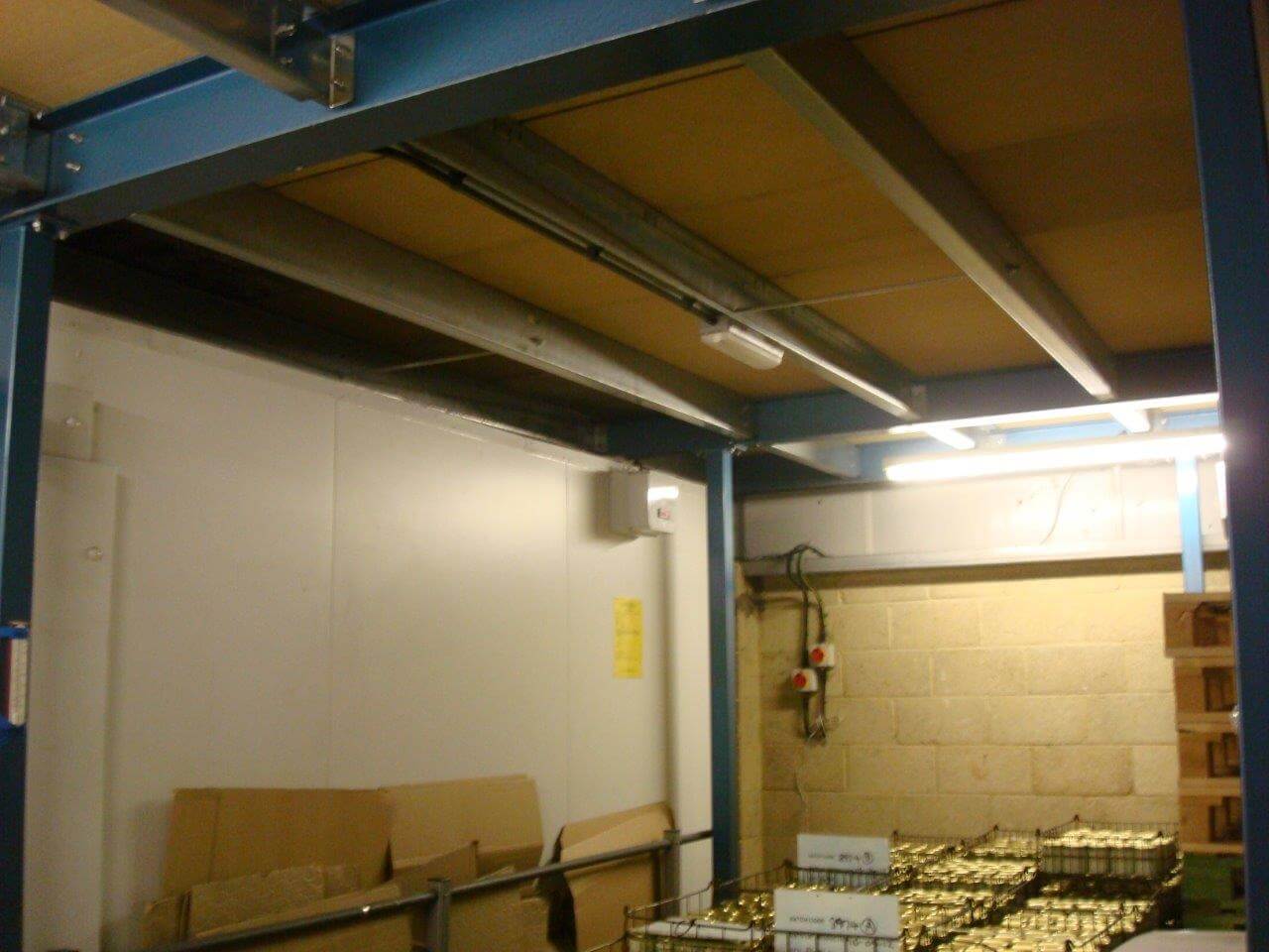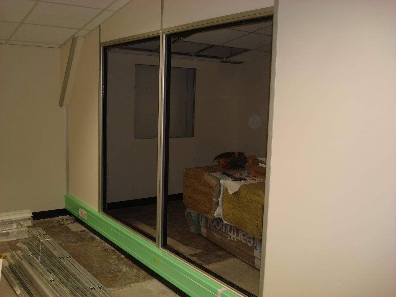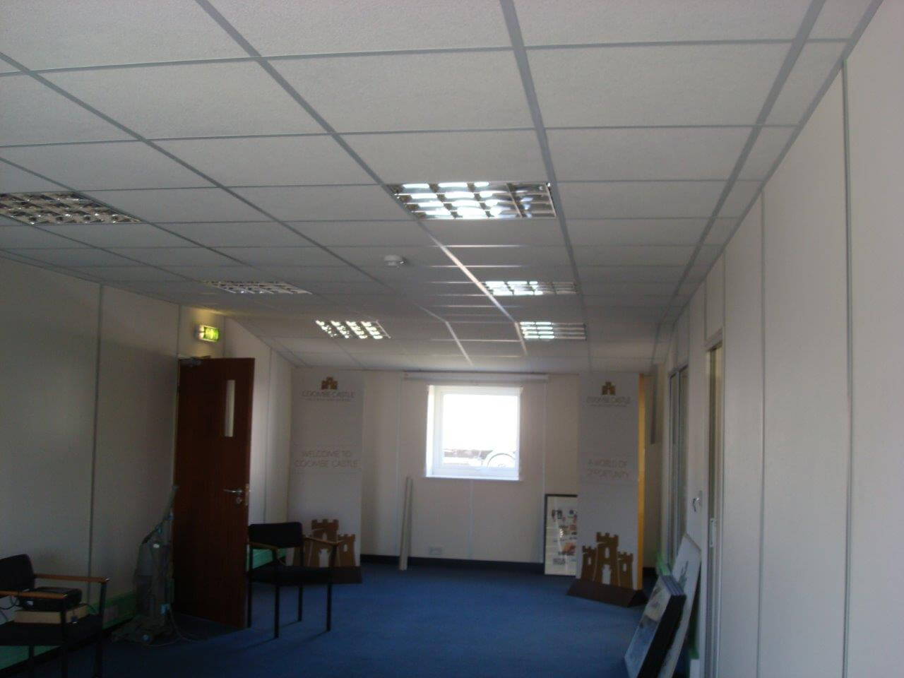 The mezzanine floor had to be turned around and a new jumbo stud fire wall constructed. Below the mezzanine floor we created a new reception area with fire rated ceiling, decorations and flooring. Upstairs included new ceilings, carpets, plastering and decorations as well as a new kitchen. Also fitted upstairs was a new office constructed from Komfort Kameo 75mm demountable partition.