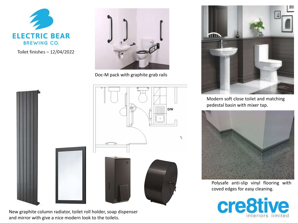 The restroom refurbishments needed to reflect the brewery’s brand identity. We curated a moodboard that contrasted dark industrial hardware with clean, contemporary sanitaryware. Diversity and inclusion were also central to the brief; we integrated a dark grey Doc-M pack into the accessible facilities to ensure the aesthetic remained cohesive while meeting all regulatory standards.