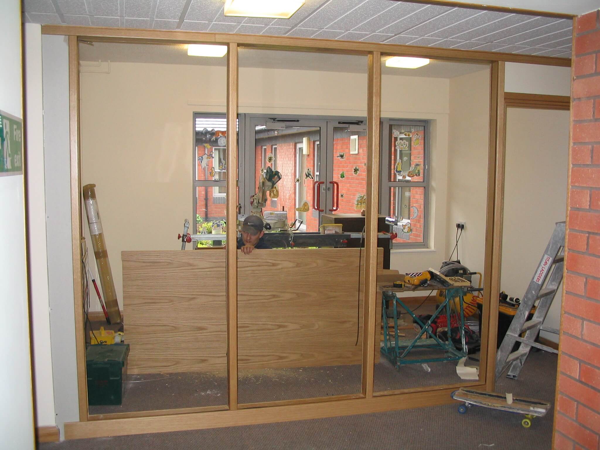 Timber demountable partitioning is slightly unusual, most demountable systems are made from aluminium. Both systems are based around a steel stud and frame structure, clad with plasterboard to complete a wall, or room divider. The timber demountable system used on this project was also air-pinned, so each of the wooden sections had no visible screws apart from tiny pin holes which were filled with light oak wax. The basic construction technique is similar between the timber demountable and aluminium demountable systems, the starting point is setting out the door frame and making sure the door frame is square and that the door swings properly. From there everything else fits around it, so glazed windows and solid panels depending on what the wall needs to be. In this case the wall mainly consisted of glass windows which were double glazed with integral blinds.